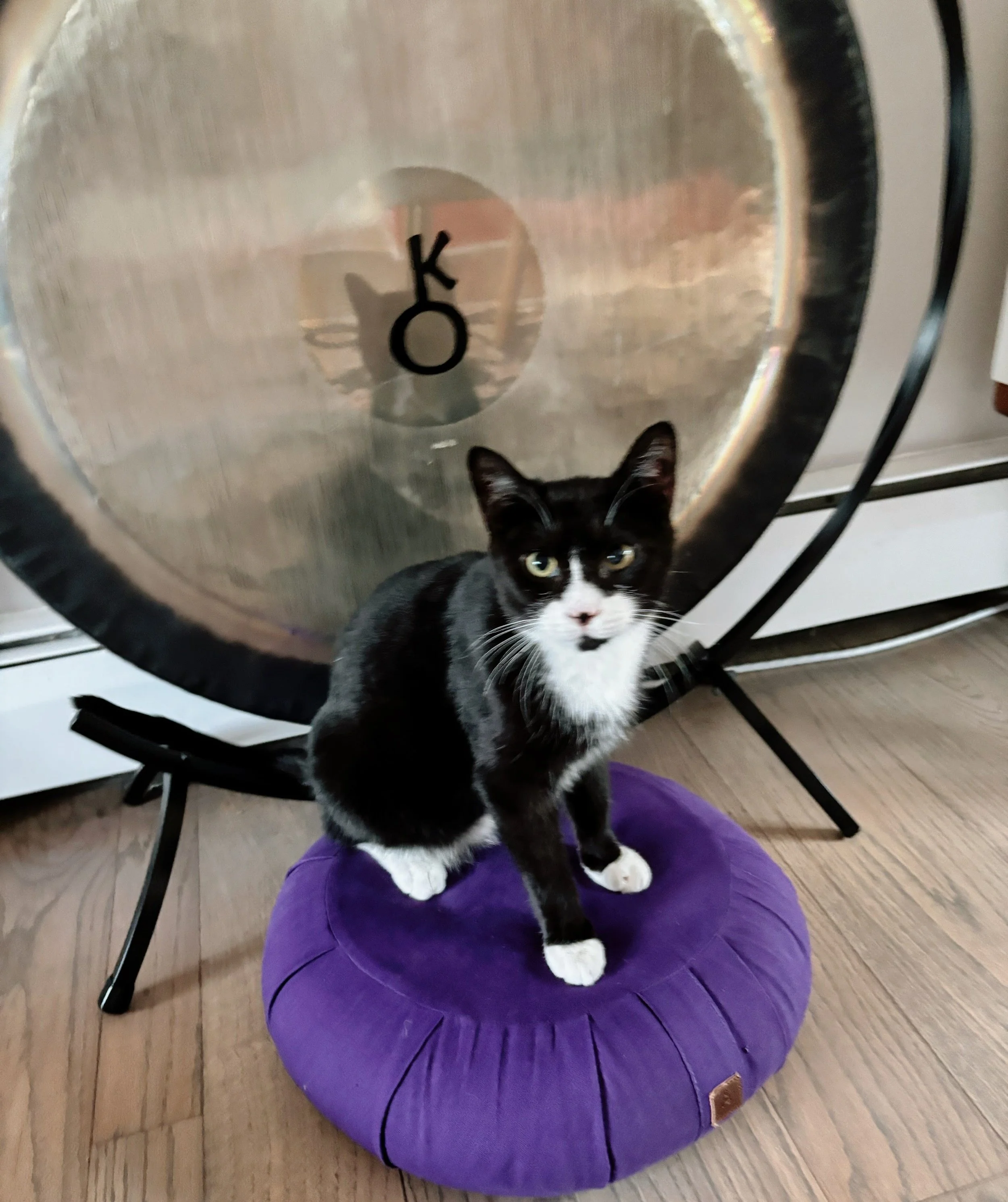 🐾 Ollie the kitten, perched before the gong — curious, bright-eyed, and ready to play. A sweet reminder that every new year (and every new day) is best welcomed with wonder. ✨🎶